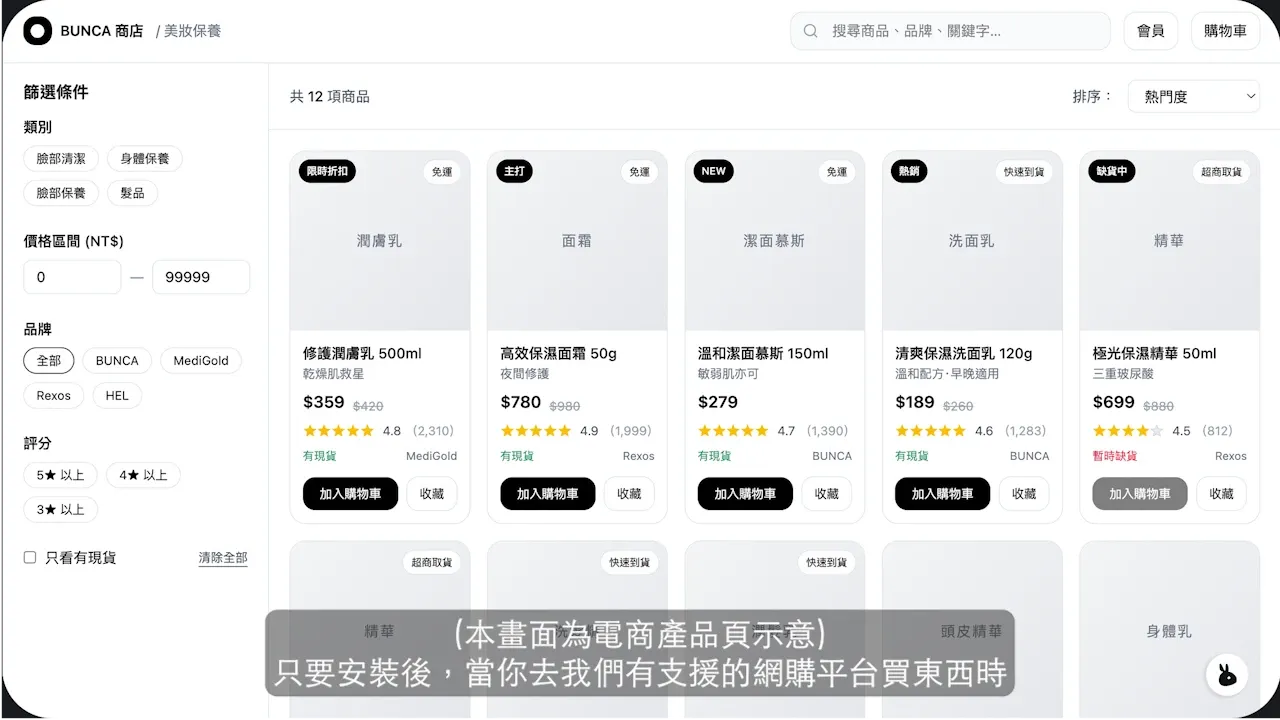 Bunca 提供瀏覽器擴充功能,只要安裝後,當你去我們有支援的網購平台買東西時,就會在右下角看到我們的小按鈕跳出來...